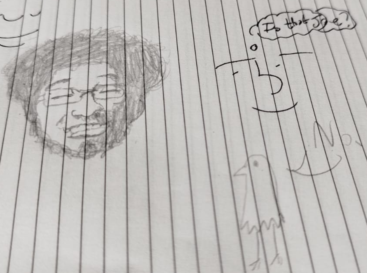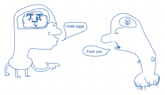 He thinks about how, maybe he got out of a chicken's ass? Maybe he just spawned into existence? Maybe someone drew him and he just gained sentience? Who knows, all he's doing is Staring pointlessly at a White grid with nothing but other Joes in the same area and space where as this Funny two legged egg resides calmly and patiently.